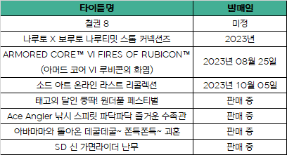 또한 10월 5일 발매 예정인 ‘소드 아트 온라인 라스트 리콜렉션’, 2023년 발매 예정인 ‘나루토 X 보루토 나루티밋 스톰 커넥션즈’ 같은 미발매 기대작과 ‘아바마마와 돌아온 데굴데굴~ 쫀득쫀득~ 괴혼’, ‘Ace Angler 낚시 스피릿 파닥파닥 즐거운 수족관’ 등 최신 발매작을 만나볼 수 있다.