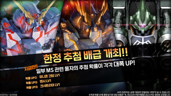 기간 중, 제1탄부터 제6탄까지 매주 특별한 한정 추첨 배급을 개최한다. 제1탄은 ‘유니콘 건담’, ‘밴시’, ‘크샤트리아’에 추첨 확률 업이 적용된 추첨 배급이며, 제2탄 이후 내용은 순차적으로 안내할 예정이다.
