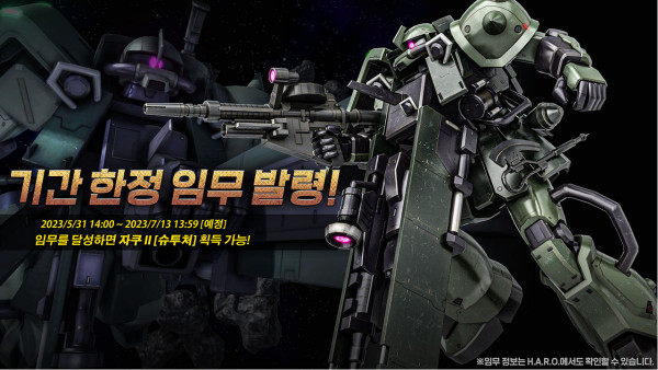 기간 한정으로 특별한 임무가 발령된다. 임무를 달성하면 신규 기체 ‘자쿠Ⅱ[슈투처]’와 DP 합계 200,000, 정비사 증원 티켓 [★]~[★★★] 각 50장 등 특별한 보수를 획득할 수 있다.