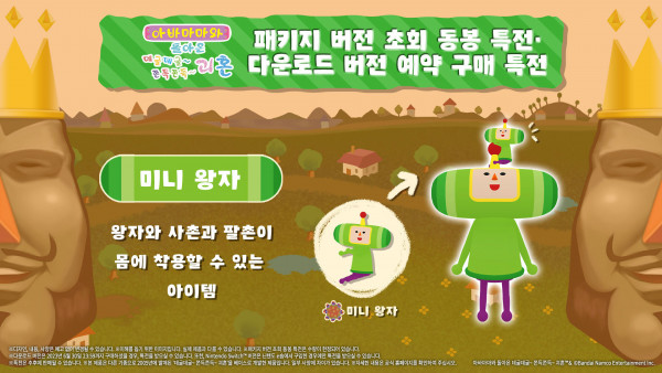 패키지 버전의 초회판을 구매하거나 다운로드 버전을 6월 30일 23:59까지 구매하는 경우, 왕자와 사촌과 팔촌이 몸에 착용할 수 있는 의상 아이템 ‘미니 왕자’를 특전으로 받을 수 있다.