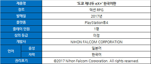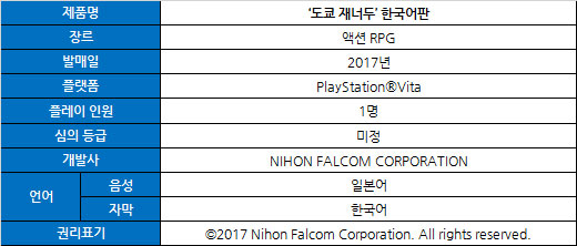 또한 PlayStation®Vita용 타이틀 ‘도쿄 재너두’ 및 PlayStation®4용 타이틀 ‘도쿄 재너두 eX+’의 한국어화가 결정되었으며, 2017년 발매 예정이다. 자세한 내용은 추후 공개될 예정이다.