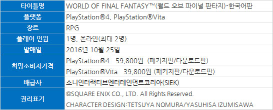 소니인터랙티브엔터테인먼트코리아(SIEK)는 SQUARE ENIX의 인기 타이틀 ‘FINAL FANTASY® ‘시리즈의 PlayStation®4, PlayStation®Vita 전용 타이틀 ‘WORLD OF FINAL FANTASY™’의 한국어판을 2016년 10월 25일에 국내 발매한다.