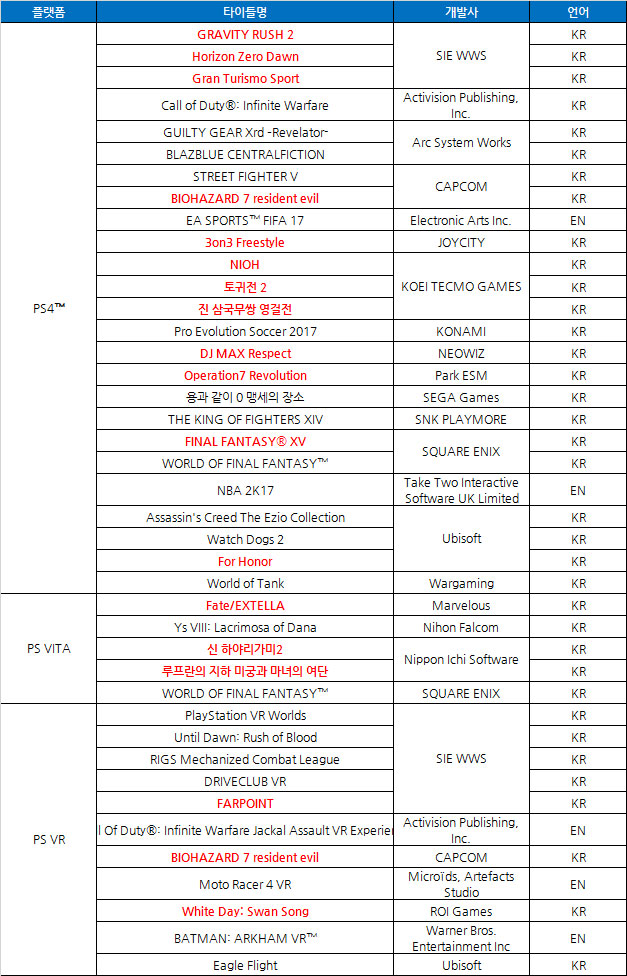 * 빨간색으로 별도 표시된 발매 예정 타이틀의 경우 지스타 2016 개최 시점인 11월 17일 기준