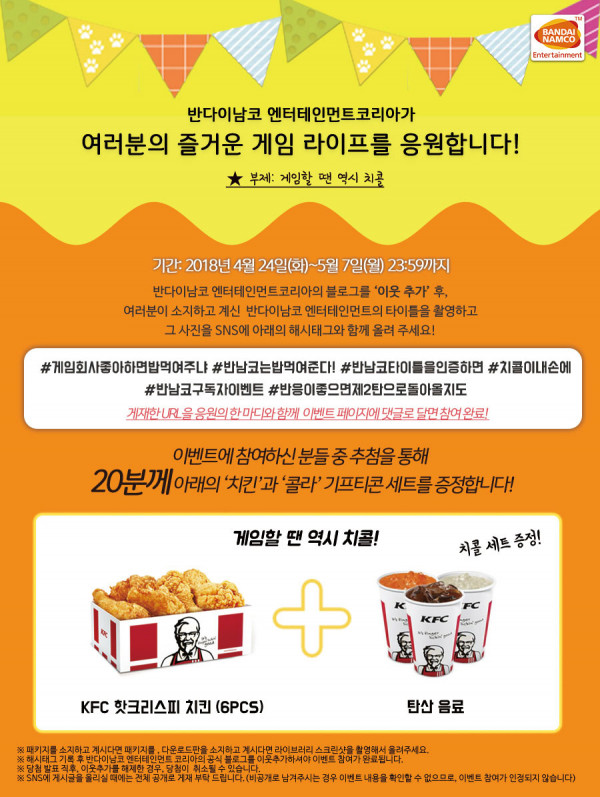 본 이벤트는 반다이남코 엔터테인먼트 코리아 공식 블로그를 이웃추가 하고 본인 소유의 BNEK 타이틀과 응원의 한마디를 자신의 SNS에 공유 후, URL을 덧글로 이벤트 페이지에 남기는 방식으로 참여 가능하며 추첨을 통해 KFC 치킨과 콜라의 쿠폰을 증정한다.