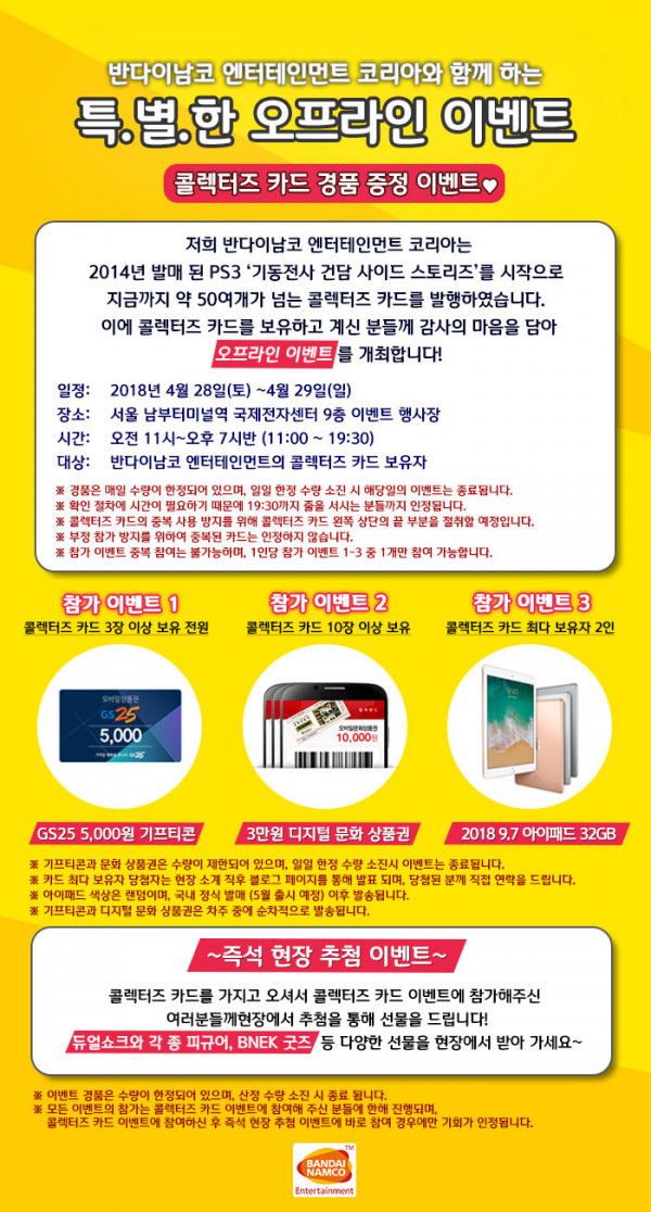 먼저, 4월 28일과 29일 양일간 서울 국제전자센터 9층에서 반다이남코 엔터테인먼트 코리아 고유의 예약 판매 아이템으로 제공 해온 콜렉터즈 카드 수집 유저들을 위한 오프라인 이벤트 ‘콜렉터즈 카드 경품 증정 이벤트’를 실시한다. 콜렉터즈 카드는 지난 2014년 PS4로 발매 되었던 ‘기동전사 건담 사이드 스토리즈’를 시작으로 지금까지 약 50개가 넘는 타이틀의 예약 판매 아이템으로 제공된 바 있다.