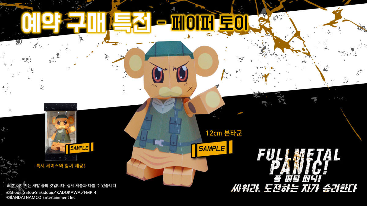 한편, 2018년 5월 31일에 정식으로 발매될 ‘풀 메탈 패닉! 싸워라, 도전하는 자가 승리한다’(한국어판)의 예약 판매는 5월 23일부터 시작된다. 이 기간 동안 예약을 한 유저에게는 페이퍼 토이 ‘본타군’을 증정하며, 초회동봉특전으로는 암 슬레이브용 스페셜 무기 6종의 프로모션 코드를 제공한다. 각 특전에 대한 자세한 내용은 아래와 같다.
