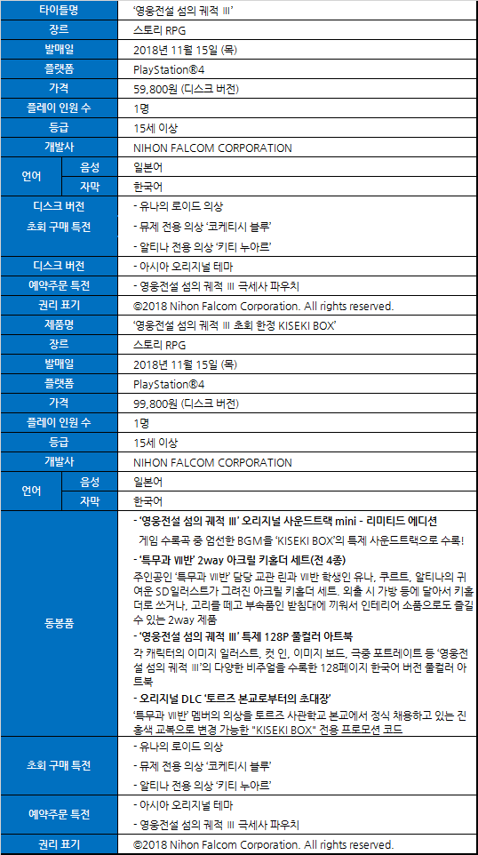소니인터랙티브엔터테인먼트코리아(이하 SIEK, 대표: 안도 테츠야)는 PlayStation®4(이하 PS4™)용 소프트웨어 ‘영웅전설 섬의 궤적 Ⅲ’ 한국어 버전을 2018년 11월 15일(목)에 발매한다. 또한, 호화 4대 아이템을 특별 제작한 아트 BOX에 동봉한 ‘영웅전설 섬의 궤적 Ⅲ 초회 한정 KISEKI BOX’도 같은 날 함께 발매된다.