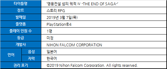 - PlayStation®4용 ‘영웅전설 섬의 궤적 Ⅳ -THE END OF SAGA-‘ 한국어 버전 2019년 3월 7일(목) 발매