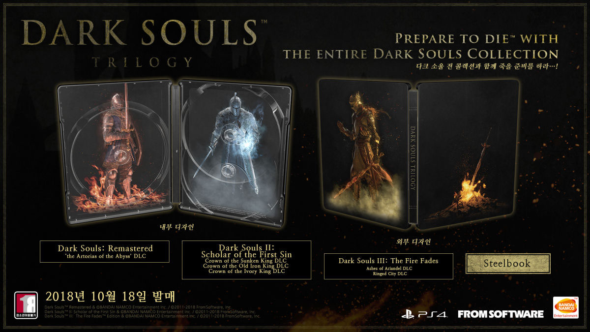 금일 발매된 ‘DARK SOULS™ TRILOGY (다크 소울 트릴로지)’는 ‘DARK SOULS™: Remastered’, ‘DARK SOULS™ II: Scholar of the First Sin’ 그리고 ‘DARK SOULS™ III: The Fires Fade Edition’까지 총 세 가지 다크 소울 작품을 한정 스틸북내에 동봉하여 제공한다.