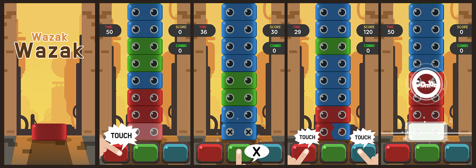 이번에 공개한 ‘와작 와작(wazak wazak)’은 3가지 색으로 이루어진 블록의 탑을 제한시간 내로 블록색깔에 맞춰서 버튼을 눌러서 블록을 부수는 모바일 퍼즐게임이다.