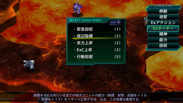한편, ‘엑스트라 오더’는 전투 맵 중 전함 유닛만이 사용할 수 있는 커맨드로, ExC의 소비 카운트 수에 따라 주위의 아군 유닛에게 다양한 효과를 부여한다. 그리고 전함 유닛만이 사용할 수 있는 ‘엑스트라 오더’에는 아래의 5종류의 효과가 있다. 단, ‘기력 상승’이외의 커맨드는 자기 유닛에게 사용할 수 없다.