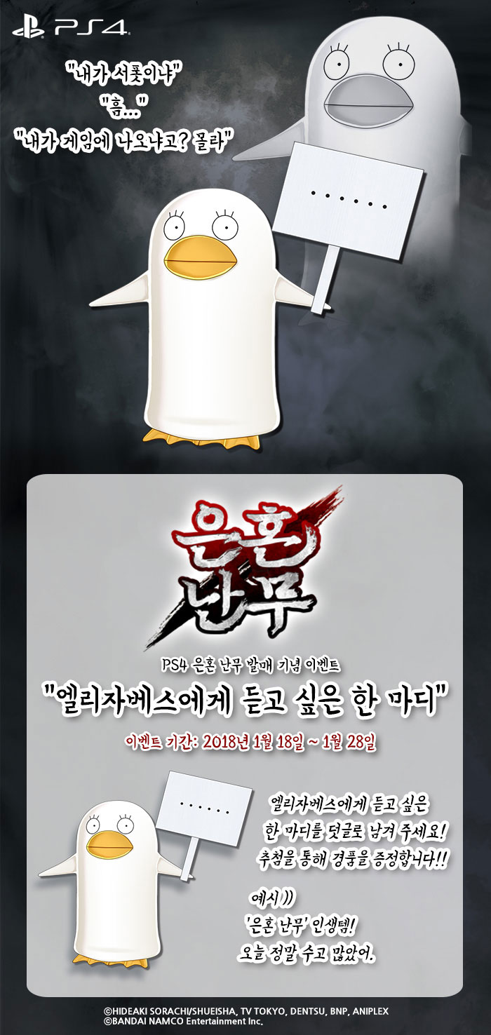 한편 ‘은혼 난무’의 한국어판 발매를 기념하여 반다이남코 엔터테인먼트 코리아 공식 블로그에서는, 오는 1월 28일까지 엘리자베스에게 듣고 싶은 한 마디를 덧글로 남기는 유저에게 추첨을 통해 호화 경품을 증정한다. 자세한 사항은 반다이남코 엔터테인먼트 코리아 공식 블로그(http://bneblog.co.kr/221187753901)에서 확인할 수 있다.