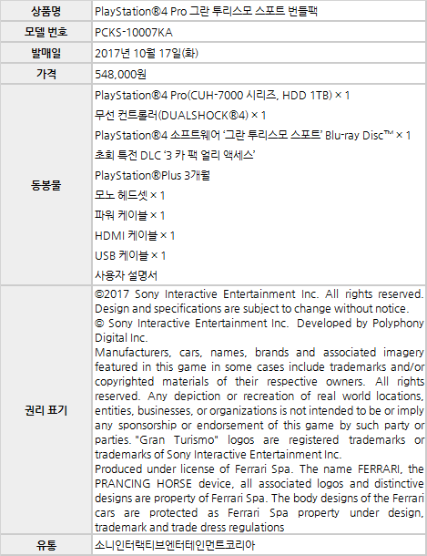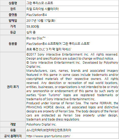 소니인터랙티브엔터테인먼트코리아(이하 SIEK, 대표: 안도 테츠야)는 PlayStation®4 Pro(이하 PS4™ Pro)와 PlayStation®4(이하 PS4™)용 소프트웨어 ‘그란 투리스모 스포트’를 함께 저렴하게 구매할 수 있는 수량 한정 상품 ’PlayStation®4 Pro 그란 투리스모 스포트 번들팩’을 2017년 10월 17일(화) 548,000원에 출시한다.
