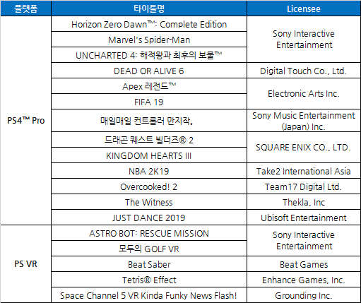 - 발매 예정작인 ‘KINGDOM HEARTS III(킹덤 하츠 III)’ 한국어 자막 버전을 비롯한 다양한 PlayStation®4 및 PlayStation®VR 타이틀 총 18종 시연 기회 제공