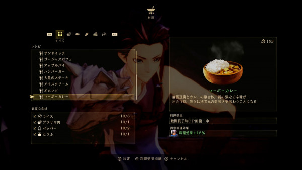 시리즈 전통의 ‘독특한’ 요리도 즐길 수 있다. 캐릭터마다 각자 잘하는 요리가 있어, 그들이 잘하는 요리를 맡기면 전용 연출이 전개된다. 또한 이벤트 등을 통해 레시피를 습득하여 요리를 먹으면 전투에 도움이 되는 다양한 버프 효과를 얻을 수 있다.