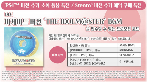※이해를 돕기 위한 이미지입니다. ※특전은 게임 내에서만 사용하실 수 있습니다. ※이 특전은 프로모션 코드를 입력하여 키를 개방한 후, 'OPTION'>'사운드' 내의 '일부 BGM 전환'에서 설정하면 사용하실 수 있습니다. ※이 특전으로 BGM을 전환할 수 있는 것은 일부 장면뿐입니다. ※본 특전은 추후 판매될 수 있습니다. ※내용 및 사양은 예고 없이 변경될 수 있습니다. ※본 특전을 사용하실 때에는 최신 업데이트 적용이 필요합니다. 【PS4™ 버전】 ※본 특전은 패키지 버전과 다운로드 버전 모두에 제공됩니다. ※패키지 버전에 제공되는 특전은 수량이 한정되어 있습니다. ※특전 프로모션 코드가 동봉된 제품에는 패키지 겉 포장 비닐에 스티커가 붙여 있습니다. ※프로모션 코드는 1번만 사용할 수 있으며, 유효 기간이 있습니다. (2022년 10월 13일 23:59까지) ※프로모션 코드를 이용하시려면 게임기 본체를 인터넷에 접속할 수 있는 환경과 PlayStation™Network의 계정이 필요합니다. ※PlayStation®4의 다운로드 버전은 2021년 11월 10일 23:59까지 구입했을 경우 제공됩니다. 【Steam®】※Steam® 버전은 2021년 10월 13일 23:59까지 다운로드 버전을 예약하면 제공됩니다.