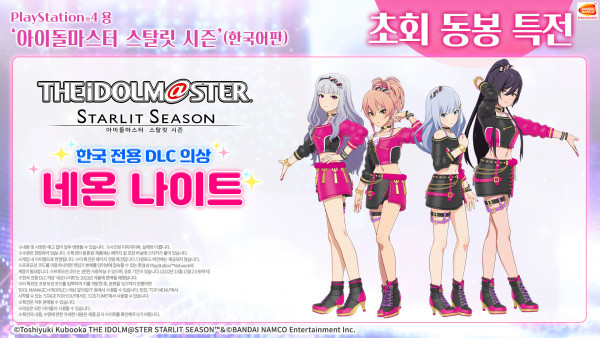 한국 프로듀서를 위한 DLC 의상 ‘네온 나이트’는 패키지 버전의 초회 동봉 특전으로 제공된다. 귀여움을 강조한 강렬한 핑크 컬러에 차분한 블랙 컬러를 매치하여, 쿨하고 세련된 스타일과 사랑스러운 매력을 함께 표현했다.