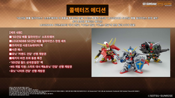 'SD건담 배틀 얼라이언스 콜렉터즈 에디션'을 통해서만 얻을 수 있는 특별한 건프라 'LEGENDBB SD건담 배틀 얼라이언스 한정 세트' 등이 포함된 콜렉터즈 에디션! LEGENDBB 시리즈로부터 '무사 건담', '나이트 건담', '커맨드 건담'의 한정 컬러 3기가 집결!