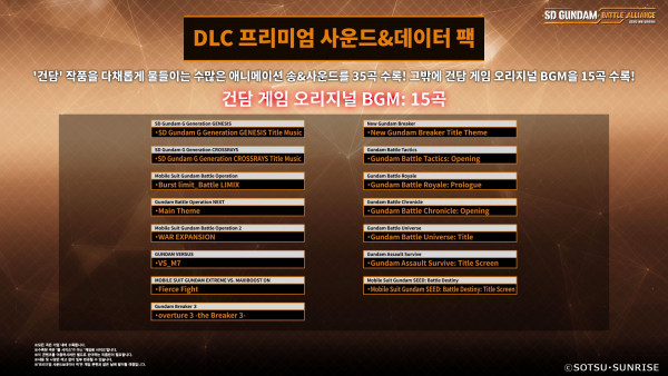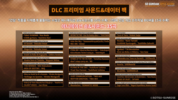 '건담' 작품을 다채롭게 물들이는 수많은 애니메이션 송&사운드 35곡 및 확장 파츠와 CAPITAL을 수록한 DLC 발매 결정! 건담 게임 오리지널 BGM도 15곡 수록된다.