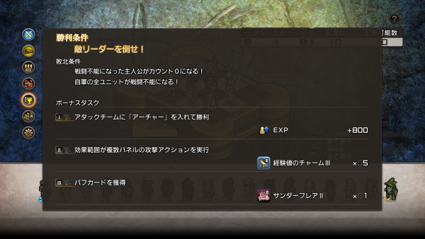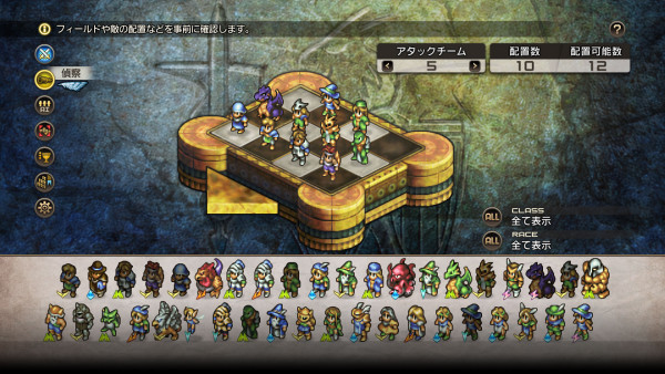 어택팀 편성 화면에 있는 「정찰」커맨드로 이제부터 필드에서 싸울 적의 정보(배치, 레벨, 클래스, 장비 등)를 확인하실 수있습니다. 어택팀 편성 화면에서는 유닛의 클래스 체인지나 장비 내용을 변경할수있으므로, 지형이나 적의 정보를 참고하여 효과적인 어택팀을 편성합시다.