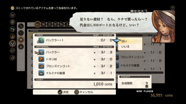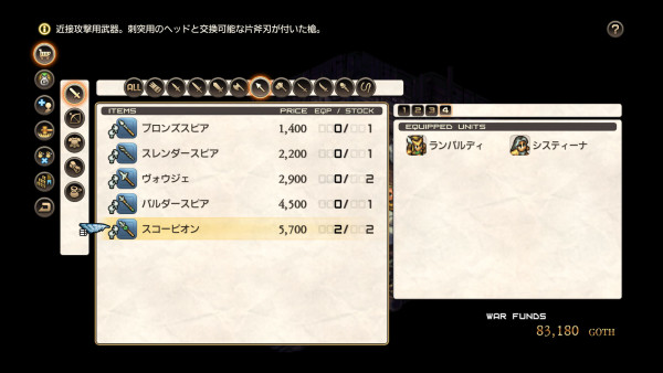 『Tactics Ogre: Let Us Cling Together』에서는 무기나 갑옷 등의 「무구」, HP 회복약 등의 「소모품」, 「마법」을 사용하려면 유닛의 레벨 제한이 있거나 전용 스킬이 따로 필요했습니다.
