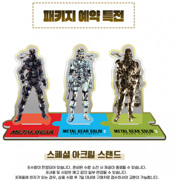 또한, 17일(화)부터 온라인 쇼핑몰 소프라노(http://www.sofrano.com/)를 포함한 다양한 온라인 마켓에서 예약판매가 진행될 예정이며, 패키지 예약 특전으로 메탈 기어 솔리드, 메탈 기어 솔리드 2, 메탈 기어 솔리드 3의 메인 일러스트로 제작된 스페셜 아크릴 스탠드(한정 수량)를 제공할 예정이다.