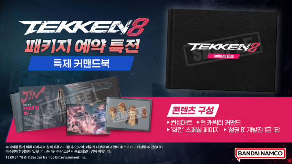 ‘철권 8’(한국어판)의 PlayStation®5, Xbox Series X|S용 패키지 버전을 예약 구매하시는 모든 분들께 ‘특제 커맨드북’을 증정한다. 초기 로스터 32명 캐릭터의 커맨드가 담겨 있는 ‘특제 커맨드북’에는 전 캐릭터의 커맨드 외에도 컨셉아트, ‘화랑’ 스페셜 페이지, ‘철권 8’의 개발진 1문 1답이 수록되어 있다.