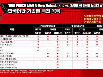 - PlayStation®4, Xbox One 버전 2월 27일, PC(STEAM®) 버전 2월 28일 발매반다이남코 엔터테인먼트 코리아(대표 제랄드 누난)는 대전 액션 게임 ‘ONE PUNCH MAN A Hero Nobody Knows’(원펀맨 어 히어로 노바디 노우즈) 한국어판 패키지의 선주문 판매를 2월 13일부터 실시한다고 밝혔다.■ 게임 소개- 새…