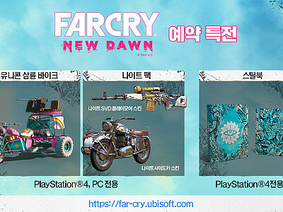 - FAR CRY® NEW DAWN 한국어판 PlayStation®4, Xbox One, PC 2월 15일 발매- 예약 구매 특전에 유니콘 삼륜 바이크와 나이트 팩 포함인트라게임즈(대표 배상찬)는 유비소프트(지사장 홍수정)와 협력하여 PlayStation®4, Xbox One, PC용 FPS “FAR CRY® NEW DAWN (이하 파 크라이 뉴 던)” 한…