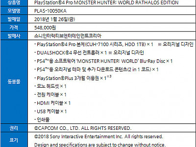 소니인터랙티브엔터테인먼트코리아(이하 SIEK, 대표: 안도 테츠야)는 PlayStation®4 Pro(이하 PS4™ Pro, CUH-7100 시리즈/HDD: 1TB)의 특별 디자인 모델 ‘PlayStation®4 Pro MONSTER HUNTER: WORLD RATHALOS EDITION’을 수량 한정으로 2018년 1월 26일(금) 548,000원에 발매…