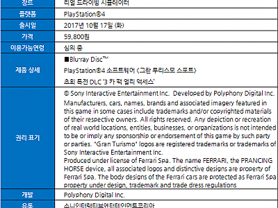 소니인터랙티브엔터테인먼트코리아(SIEK, 대표 안도 테츠야)는 전세계에서 7,690만장 이상의 누적 판매량을 기록한 그란 투리스모 시리즈의 최신작 PlayStation®4(PS4™)용 《그란 투리스모 스포트》를 스탠더드 에디션59,800원, 초회 한정판 ‘리미티드 에디션’을 69,800원, 초회 한정 ‘컬렉터스 에디션’을 139,800원에 2017년 10월…