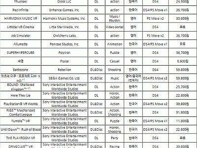 소니인터랙티브엔터테인먼트코리아(이하 SIEK, 대표: 안도 테츠야)는 PlayStation®VR(이하 PS VR) 발매일인 10월 13일에 27개의 PS VR타이틀을 발매한다. 이번에 발매되는 타이틀은 하드코어 게임, 캐주얼 게임, 360도 전방위 무비, 애니메이션 영화 등 다양한 장르를 포함하며, PS VR을 통해서만 경험할 수 있다. 주요 타이틀 라인업…