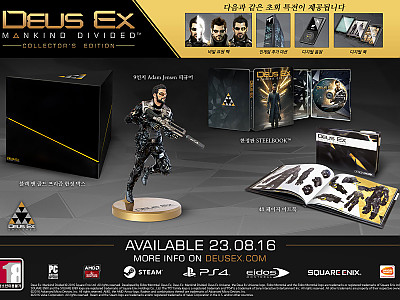 - 9인치 피규어와 아트북, STEELBOOK™이 포함된 호화 한정판 ‘콜렉터즈 에디션’ 발매 결정- 2종의 인게임 DLC와 다양한 디지털 콘텐츠를 초회동봉특전으로 증정반다이남코 엔터테인먼트 코리아(지사장 박희원)는 오는 8월 23일 발매 예정인 PS4, PC용 액션게임 ‘Deus Ex: Mankind Divided™’의 예약 판매 정보를 발표했다.‘Deu…
