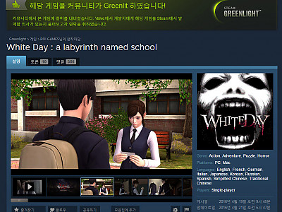 - 화이트데이, 이틀 만에 스팀 그린라이트 통과! (Greenlit)- 국내외 유저들로부터 뜨거운 호응 받고 이례적으로 단기간에 그린라이트 통과- 15년 만에 PC 플랫폼으로의 재도전. 2016년 상반기중 PC 버전 출시 예정15년 만에 다시 한 번 PC 플랫폼으로의 ‘귀환’을 선언한 [화이트데이: 학교라는 이름의 미궁]이 첫 번째 관문이라고 할 수 있는 …