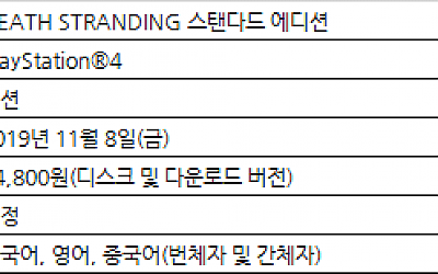 - 2019년 5월 30일(목)부터 PlayStation™Store에서 ‘DEATH STRANDING’ 다운로드 버전 예약주문 시작소니인터랙티브엔터테인먼트코리아(이하 SIEK, 대표: 안도 테츠야)는 PlayStation®4(이하 PS4™)용 소프트웨어 ‘DEATH STRANDING’을 2019년 11월 8일(금)에 발매한다. 스탠다드 에디션(디스크 및 다…