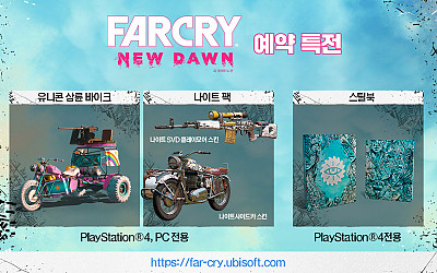 - FAR CRY® NEW DAWN 한국어판 PlayStation®4, Xbox One, PC 2월 15일 발매- 예약 구매 특전에 유니콘 삼륜 바이크와 나이트 팩 포함인트라게임즈(대표 배상찬)는 유비소프트(지사장 홍수정)와 협력하여 PlayStation®4, Xbox One, PC용 FPS “FAR CRY® NEW DAWN (이하 파 크라이 뉴 던)” 한…