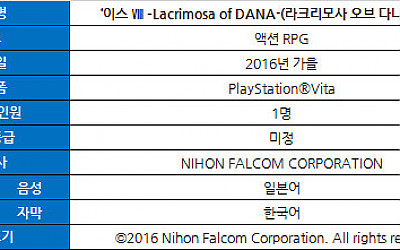 소니인터랙티브엔터테인먼트코리아(SIEK, 대표 안도 테츠야)는 ‘이스’ 시리즈 최신작, PlayStation®Vita용 타이틀 ‘이스 Ⅷ –Lacrimosa of DANA-(라크리모사 오브 다나)’ 한국어판을 2016년 가을에 발매한다. 또한 특제 사양의 3대 아이템이 동봉된 ‘이스 Ⅷ –Lacrimosa of DANA- 수량 한정 프리미엄 BOX’를 일반…