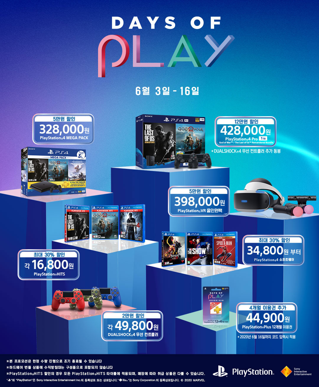 소니인터랙티브엔터테인먼트코리아(이하 SIEK, 대표: 안도 테츠야)는 2020년 6월 3일(수)부터 2020년 6월 16일(화)까지 2주 동안 PlayStation® 하드웨어, 주변기기, 소프트웨어 및 네트워크 서비스 전반에 걸쳐 특별한 할인을 제공하는 ‘Days of Play’ 세일을 진행한다.