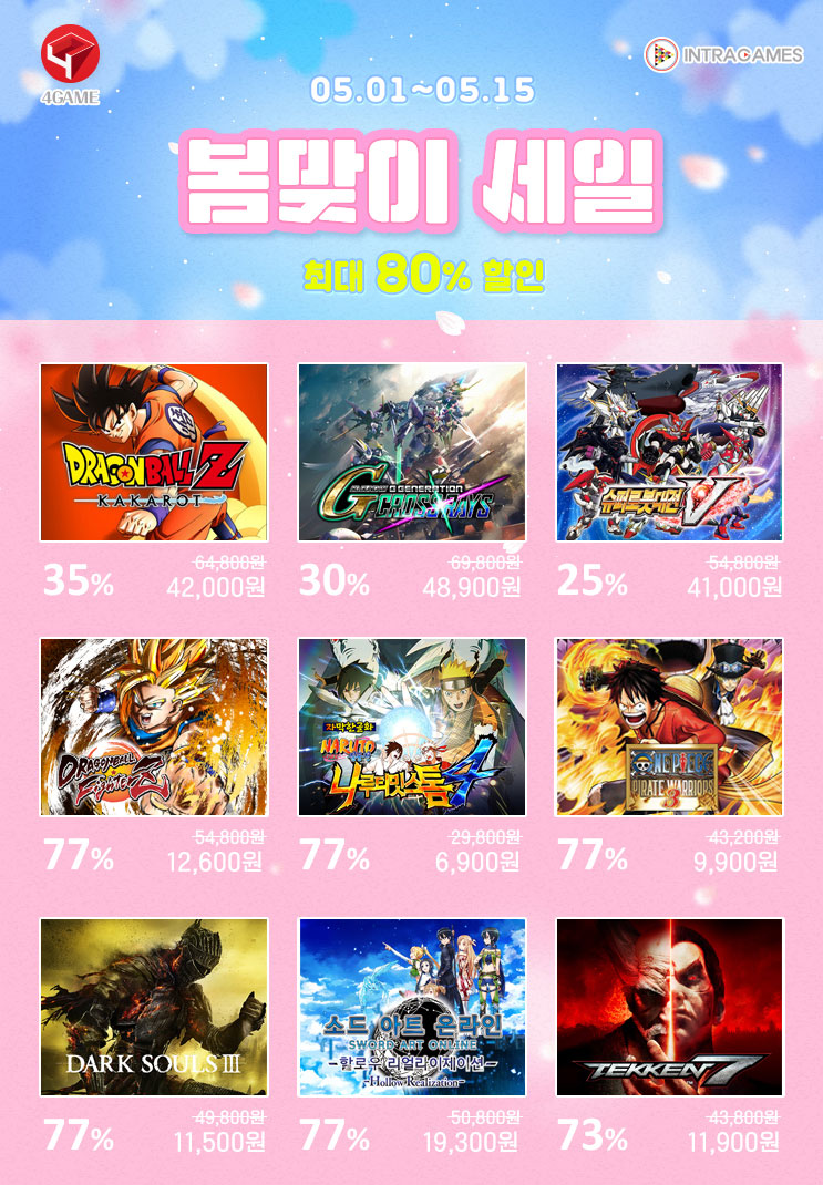 인기 타이틀이 다수 포함된 이번 봄맞이 세일은, ‘드래곤볼 Z 카카로트’, ‘다크 소울 3’, ‘철권 7’ 등의 인기 타이틀 이외에도 ‘SD 건담 지 제네레이션 크로스 레이즈’, ‘슈퍼로봇대전V’, ‘드래곤볼 파이터즈’, ‘나루토 질풍전: 나루티밋 스톰 4’, ‘소드 아트 온라인 할로우 리얼라이제이션’ 등 다양한 게임을 최대 80%의 할인된 가격으로 만나볼 수 있다.