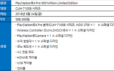 소니인터랙티브엔터테인먼트코리아(이하 SIEK, 대표: 안도 테츠야)는 PlayStation®4 Pro(이하 PS4™ Pro)의 리미티드 에디션인 ‘PlayStation®4 Pro 500 Million Limited Edition’(CUH-7100B 시리즈, HDD 2TB)을 2018년 8월 24일(금) 598,000원에 발매한다. PlayStation® 하…
