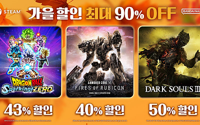- 10월 6일까지 최대 90% 할인된 가격으로 다양한 타이틀 구매 가능반다이남코 엔터테인먼트 코리아(지사장 장태근)는 오는 10월 6일까지 STEAM®에서 일부 게임 타이틀을 합리적인 가격에 구입할 수 있는 ‘STEAM® 가을 할인’을 진행한다고 발표했다.‘STEAM® 가을 할인’에서는 FromSoftware가 개발한 명작 ‘아머드 코어 VI: 루비콘의 …