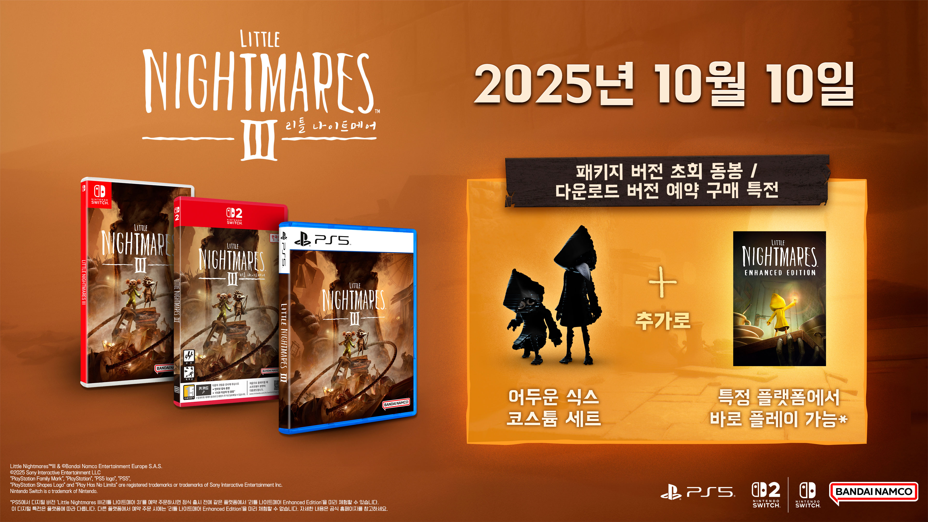 반다이남코 엔터테인먼트 코리아(지사장 장태근)는 PlayStation®5, Nintendo Switch 2, Nintendo Switch™용 ‘Little Nightmares III(리틀 나이트메어 3)’(한국어판)의 패키지 선주문 판매를 2025년 9월 18일(목) 시작한다고 발표했다.