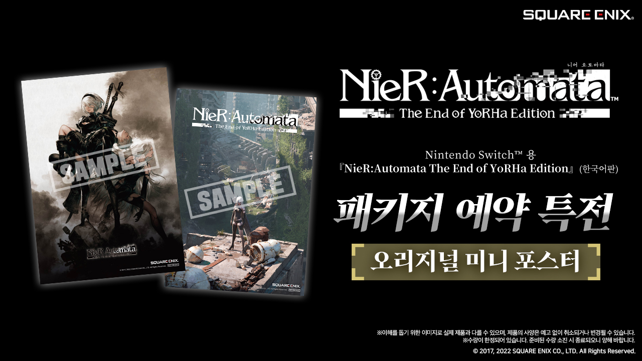 Nintendo Switch™용 ‘NieR:Automata The End of YoRHa Edition’(한국어판)의 패키지 버전 예약 특전으로는 메인 비주얼이 들어간 ‘오리지널 미니 포스터’를 증정한다.