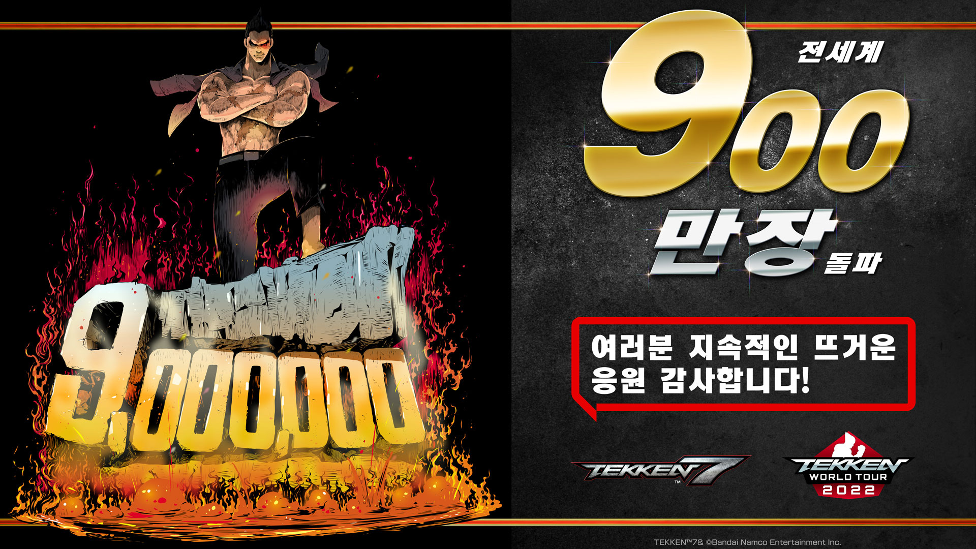 반다이남코 엔터테인먼트 코리아(대표 제랄드 누난)는 PlayStation®4, Xbox One, Steam용 3D 대전 격투 게임 ‘철권7’이 2022년 6월 1일에 발매 5주년을 맞이하여, 전 세계 누계 판매량 900만 장을 돌파했다고 발표했다.