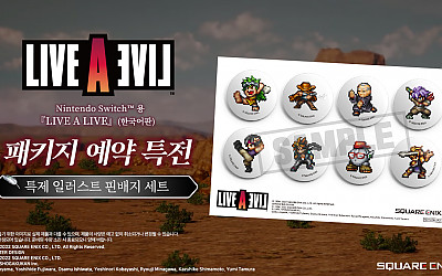 - 패키지 버전의 예약 특전으로 ‘특제 일러스트 핀배지 세트’ 증정반다이남코 엔터테인먼트 코리아(대표 제랄드 누난)는 2022년 7월 22일 발매 예정인 Nintendo Switch™용 ‘LIVE A LIVE’(한국어판)의 패키지 예약 판매를 7월 8일부터 시작한다고 발표했다.■ 패키지 예약 특전Nintendo Switch™용 ‘LIVE A LIVE’(한국…