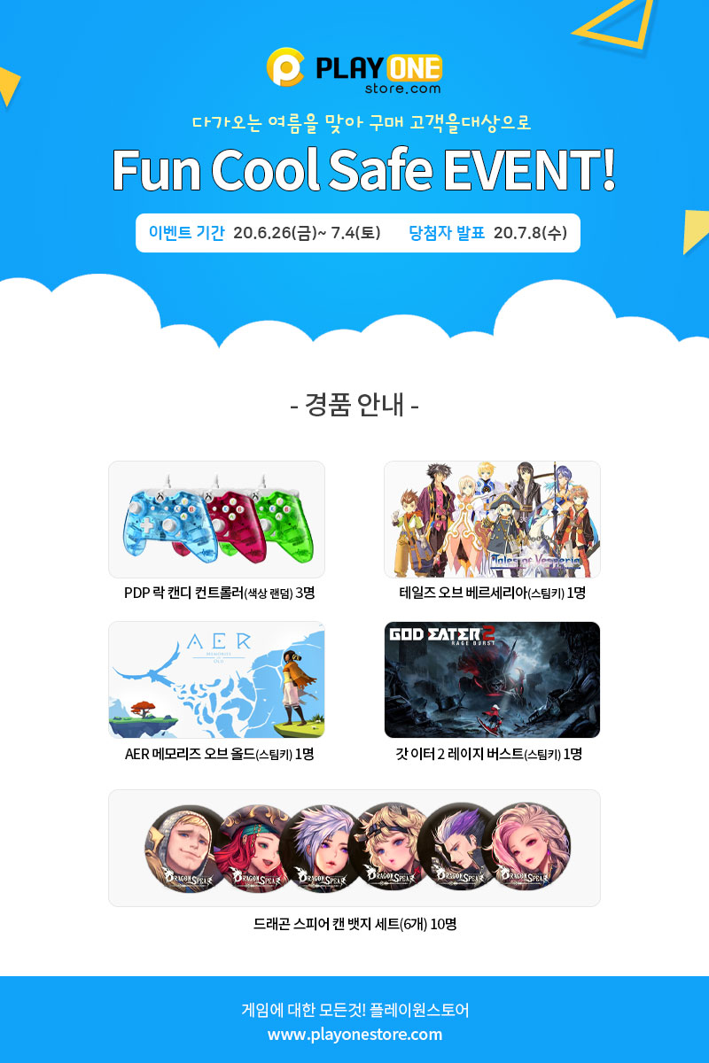 게임 디지털 유통 서비스 ‘플레이원스토어(이하, POS)’는 다가오는 여름을 맞아 즐겁고 안전한 게임이라는 컨셉으로 구매 고객을 대상으로 하는 경품 행사가 포함된 할인 프로모션을 6월 26일부터 7월 4일까지 진행한다고 밝혔다.