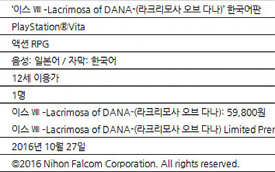 ‘이스’ 시리즈 최신작, PlayStation®Vita용 타이틀 ‘이스 Ⅷ –Lacrimosa of DANA-(라크리모사 오브 다나)’ 한국어판을 10월 27일 발매합니다. 또한 초회특전으로는 이스 Ⅷ –Lacrimosa of DANA- 오리지널 사운드 트랙(5곡) 다운로드 바우처가 동봉됩니다. ■ 이스 Ⅷ –Lacrimosa of DANA- 구성 - 발매…