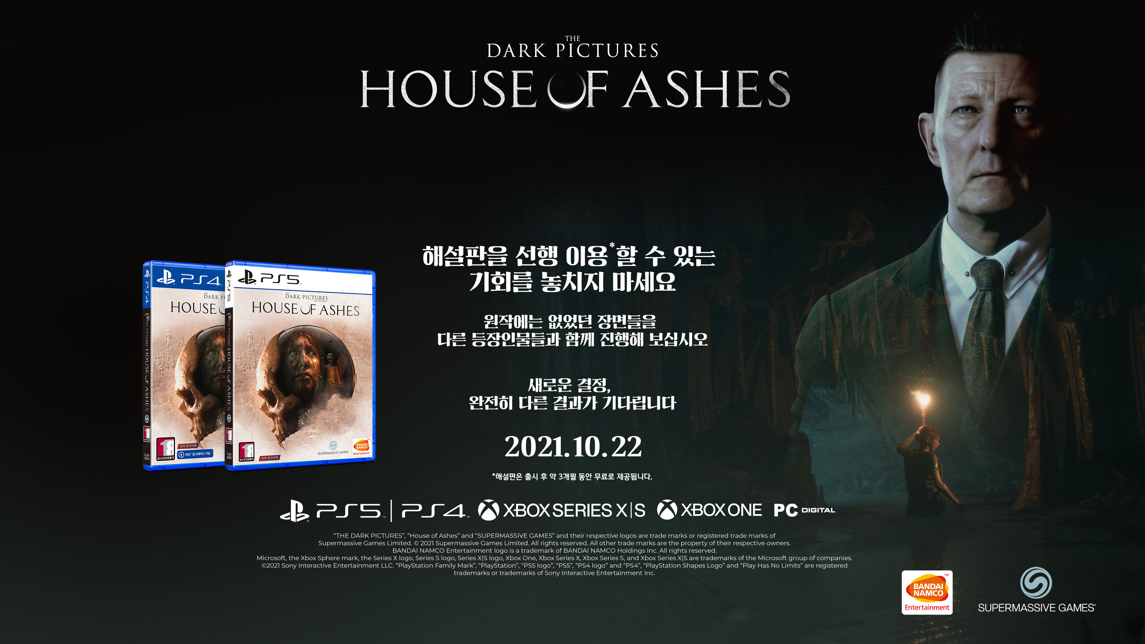 '더 다크 픽처스 앤솔로지: 하우스 오브 애쉬'(한국어판)의 PlayStation®5, PlayStation®4용 패키지 선주문 판매는 10월 8일부터 시작되며, PlayStation®5, PlayStation®4, Xbox Series X|S, Xbox One, PC 버전으로 2021년 10월 22일 발매된다.
