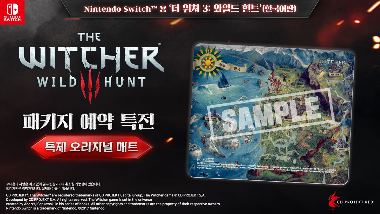 Nintendo Switch™용 ‘더 위쳐 3: 와일드 헌트’(한국어판) 패키지 버전의 예약 판매는 2021년 11월 30일 (화)부터 시작된다. 패키지 예약 시 특전으로는 Nintendo Switch™ 하드웨어 기기를 올려 두는 용도로 사용할 수 있는 ‘특제 오리지널 매트’를 증정한다.