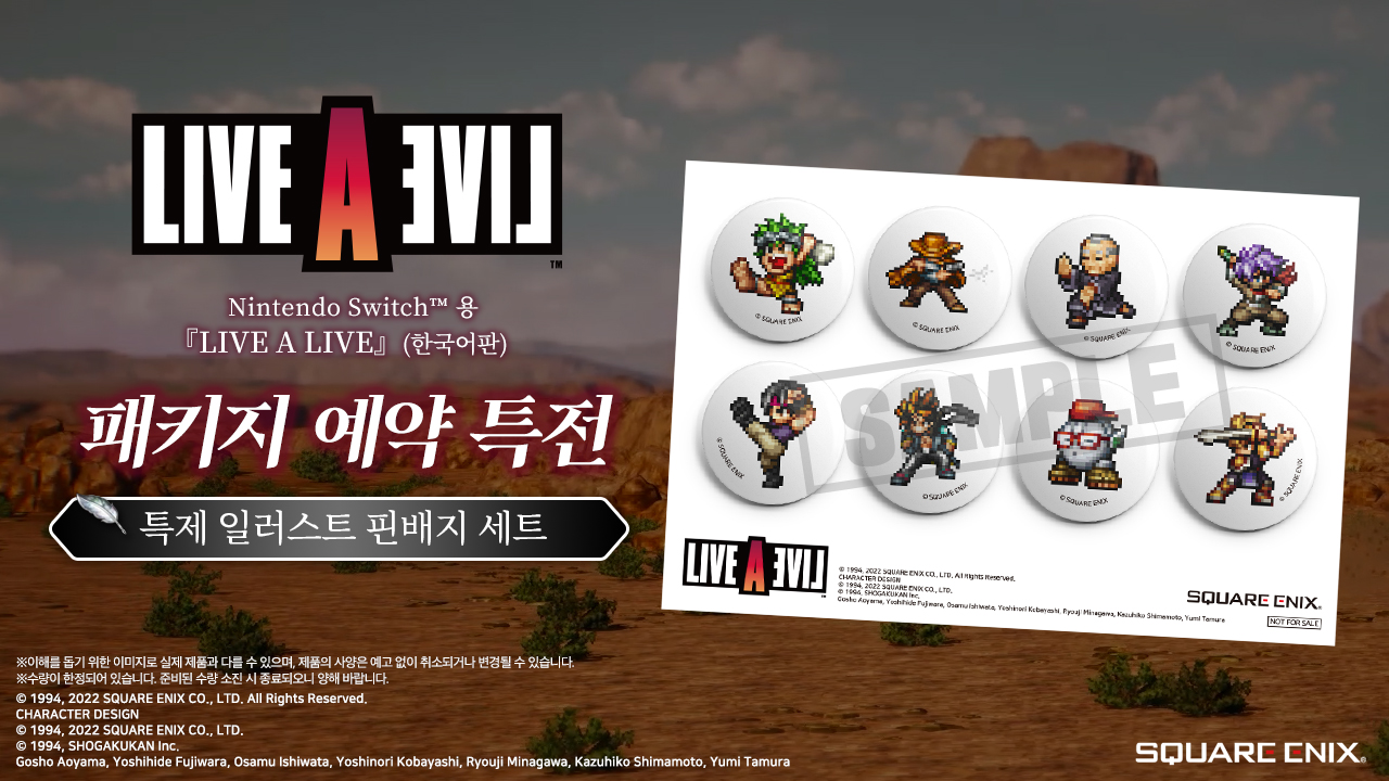 Nintendo Switch™용 ‘LIVE A LIVE’(한국어판)의 패키지 예약 특전으로는 ‘특제 일러스트 핀배지 세트’를 증정한다.